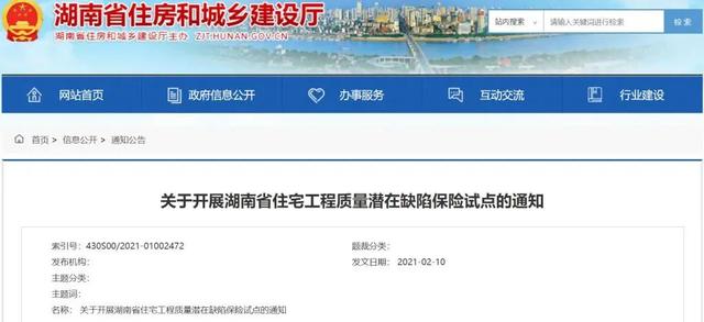 根据最新消息,湖南省住房和城乡建设厅、中国银行保险监督管理委员会湖南监管局日前共同发布《关于开展湖南省住宅工程质量潜在缺陷保险试点的通知》(以下简称《通知》)。