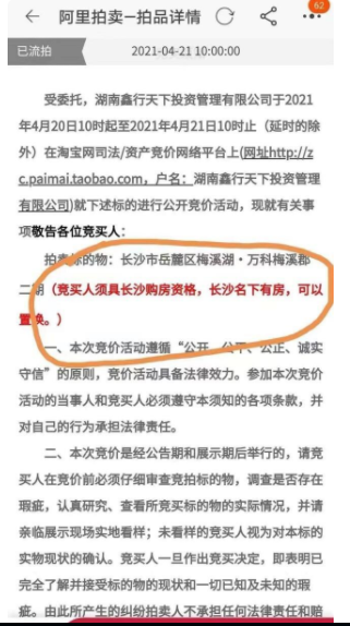 今天上午,有市民发现,一套在阿里拍卖平台拍卖的二手房(位于长沙市岳麓区梅溪湖万科梅溪郡二期)明确要求竞买入须具长沙购房资格,而在该平台5月17日即将开始的法拍一套住房,同样要求竞买人须符合当地购房政策,这是长沙市首次将法拍房纳入限购范围。